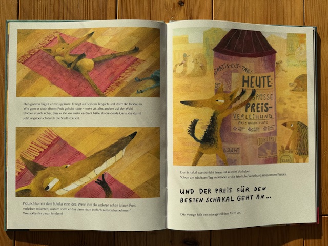 Zum Inhalt: Auf der Straße vor der Stadt liegt ein großes Tier. Oh je! Die Bewohner:innen der Stadt haben verschiedene Vorstellungen davon, was jetzt zu tun ist: das Tier unter einer Decke verbergen, eine Brücke darüber oder eine Straße drumherum bauen, … Nur das kleine Mienchen möchte von Anfang an mit dem Tier reden. Als alle Versuche fehlschlagen, tut es das dann auch. Was dann passiert, … verrate ich jetzt noch nicht!