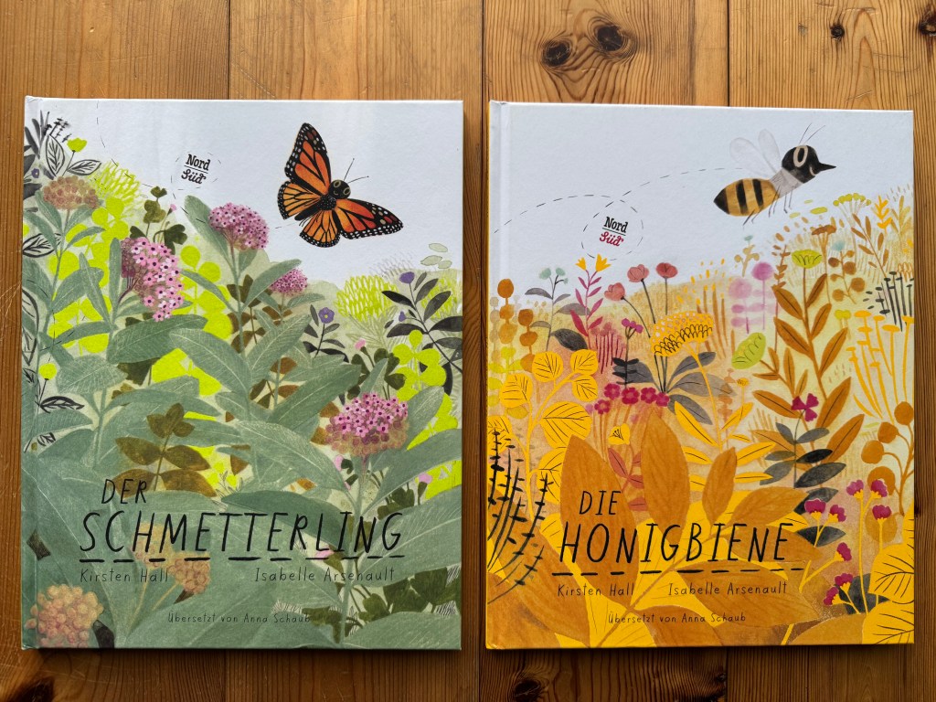 Titel: „Der Schmetterling“ und „Die Honigbiene“ Verlag: NordSüd (hier klicken) Autorin: Kirsten Hall Illustrationen: Isabelle Arsenault Übersetzung: Anna Schaub ISBN: 🦋 978-3-314-10741-2 bzw. 🐝 978-3-314-10474-9