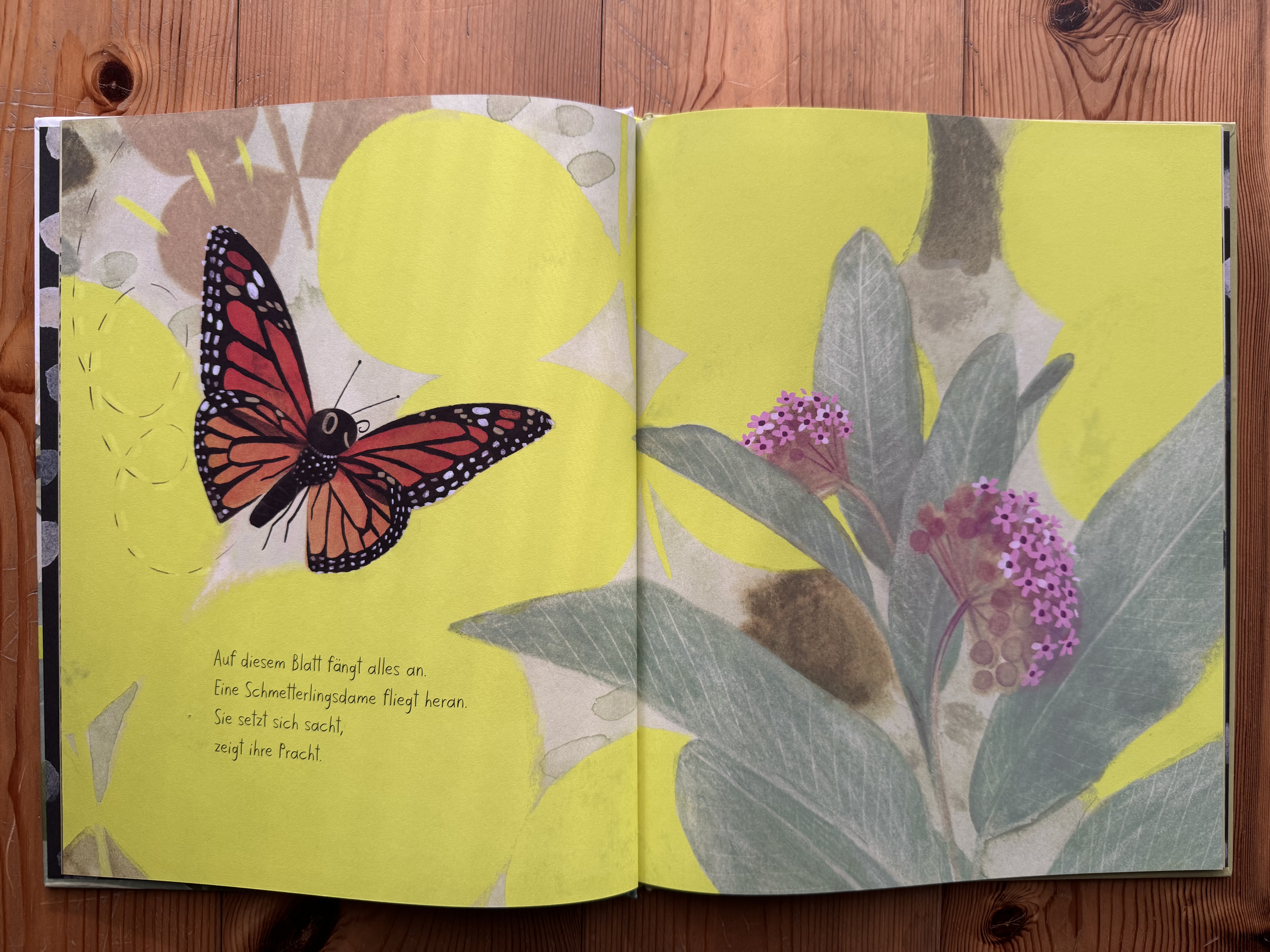 Meine Meinung: Zuerst zur Optik: die beiden Bücher sprechen mich unheimlich an und sind durch ihre Farbpalette, von der ihr auf den Fotos einen Eindruck bekommt, angenehm unaufgeregt. Vor allem in Zeiten sehr farbiger KI-Bilder allernorten ist Isabelle Arsenaults naturnaher und doch manchmal abstrakter Stil wirklich auffällig. Die Akzentfarben widersprechen der Farbpalette einerseits, passen aber andererseits hervorragend dazu – seltsam, aber für mich wahr. Inhaltlich gefallen mir die Bücher als Mutter und Lehrerin sehr, da sie sachliche Themen nicht als Sachtext aufbereiten, aber auch nicht verniedlichen oder belanglos machen. Die Zusammenhänge beim Schmetterling habe ich bewusst allerdings erst verstanden, als ich die erklärenden letzten Seiten las, da mir diese eher spezifisch amerikanischen Zugweisen nicht so bewusst waren. Die Anspielungen im Bienenbuch waren meinem Verständnis deutlich näher. Zuletzt zum Text: Poesie zu übersetzen ist in meinen Augen noch schwieriger als Prosa. Dennoch finde ich, dass Anna Schaub ein guter sprachlicher Mix gelungen ist, der Reime nicht um der Reime willen forciert und auch reimlose Stellen zulässt.