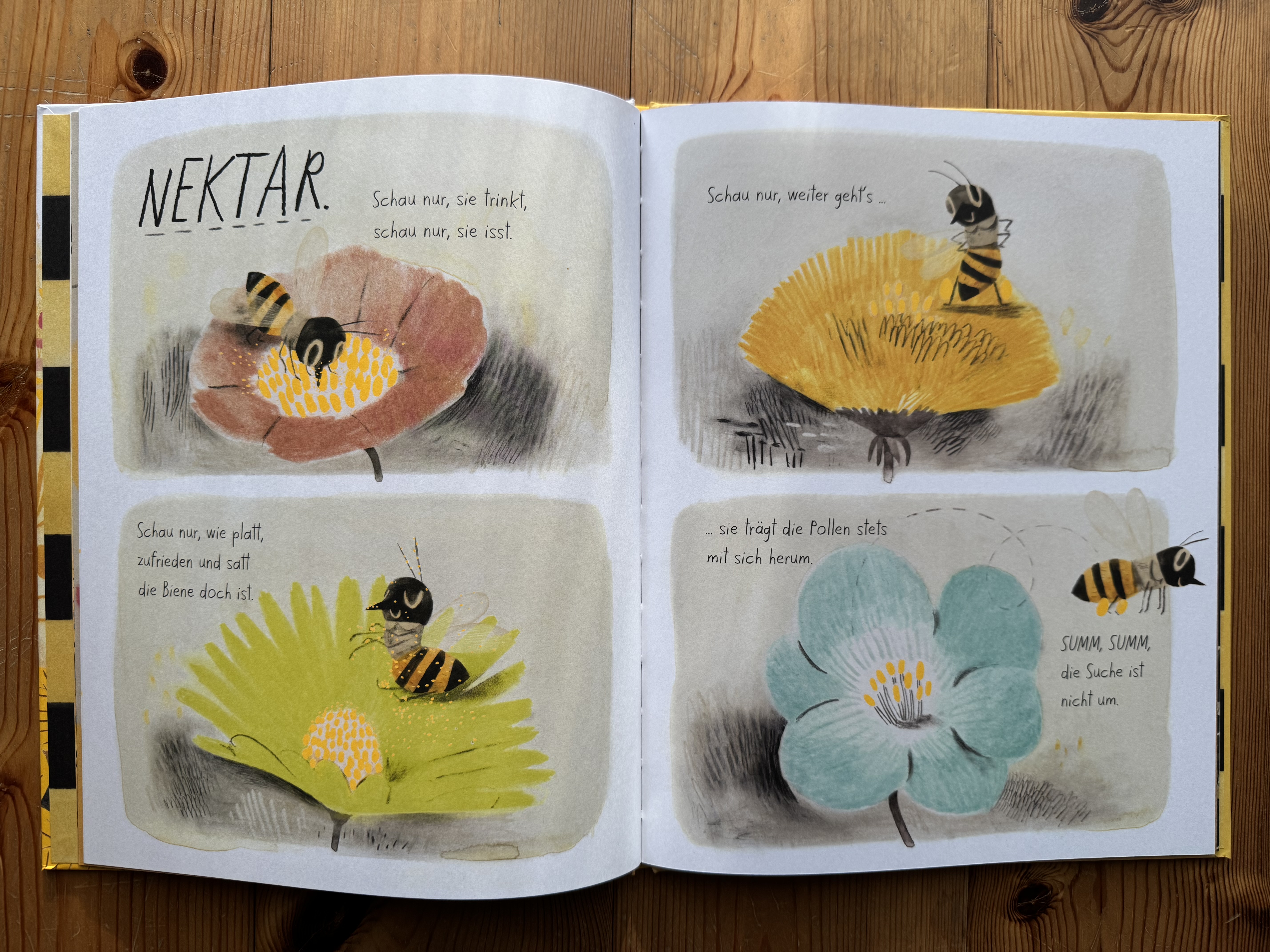 Zum Inhalt: Jedes dieser Bilderbücher porträtiert ein Tier genauer. Bei der 🐝 lernen wir als Lesende den Lebensraum und die Ernährung genauer kennen sowie zum Beispiel die Kommunikation durch Tanz. Die Lebensweise im Bienenstock findet dabei ebenso Berücksichtigung wie die Aktivitäten der Bienen auf der Blumenwiese. Dieses Buch erschien bereits 2019 (war mir aber noch nicht begegnet). Den 🦋 begleiten wir über einen ganzen Lebenszyklus vom Ei bis zur Eiablage als erwachsenes Tier. Dabei gibt es in beiden Geschichten sehr sachliche Seiten genauso wie sehr künstlerisch-poetische Szenen. Beide Bücher sind in einem gedeckten pastelligen Farbschema gehalten und haben jeweils eine neonartige Akzentfarbe (hellorange bzw.hellgrün), die sich in den Illustrationen in kleineren Details, größeren Flächen und auch als Akzentlack auf dem Cover wiederfindet. Die Geschichten der Tiere werden größtenteils gereimt erzählt und bedienen sich teils auch einer sehr lautmalerischen Sprache. Am Ende ist noch jeweils eine erklärende Seite eingefügt, die die Bedeutung der Bienen und Schmetterlinge erklärt und Möglichkeiten zum Schutz dieser Lebewesen aufzeigt.