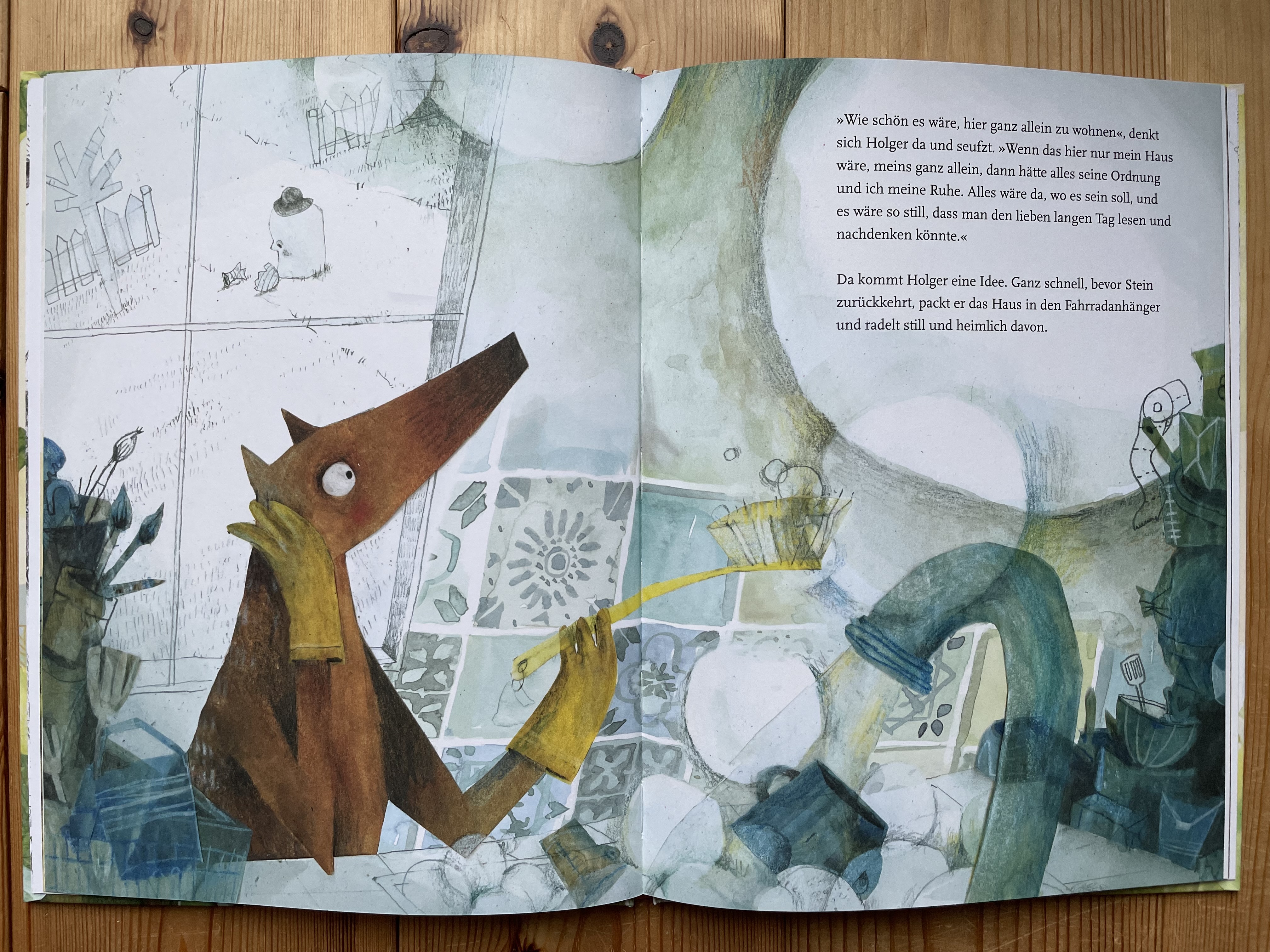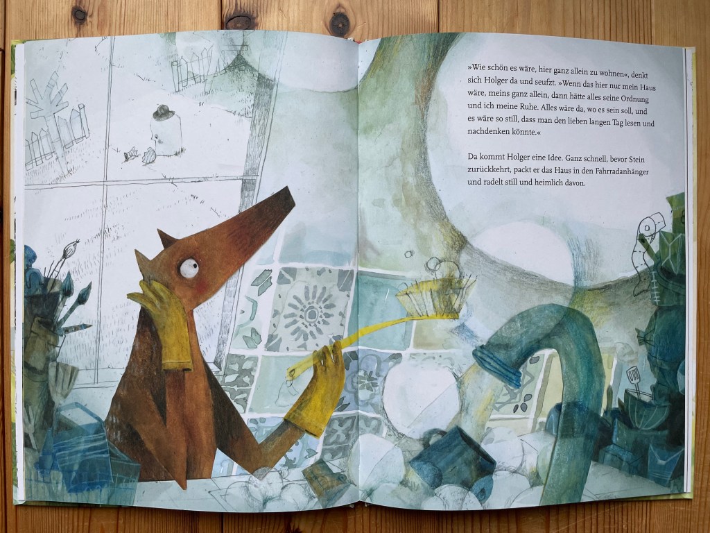 Eines Tages passiert es aber, dass Stein beim Versuch, die Küche zu streichen, ein riesiges Chaos verursacht und Holger deshalb nicht in Ruhe seine sieben Lieblingsbücher lesen kann. Im Streit fasst er den Entschluss, das Haus auf den Fahrradanhänger zu laden und wegzufahren, um allein und in Ruhe leben zu können. Gedacht – getan.