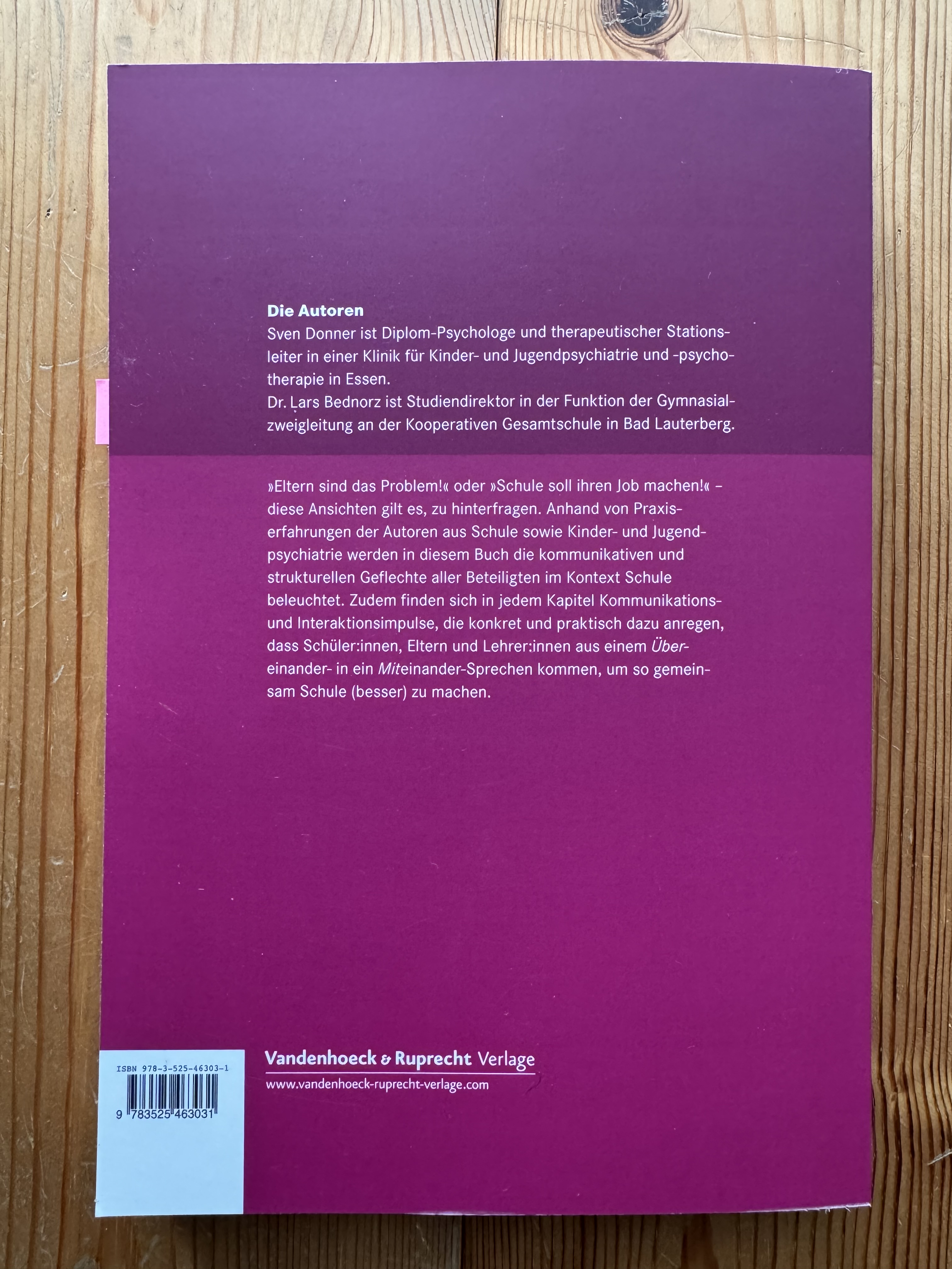 Diplom-Psychologe Sven Donner und Gymnasialzweigleiter Dr. Lars Bednorz beleuchten das Thema „Miteinander in der Schule“ aus zwei sich ergänzenden Perspektiven, nämlich der Lehrkraft und des Therapeuten. Beide haben also mit Schüler:innen und Eltern zu tun, wenn auch auf andere Art und Weise. Ihr Buch basiert auf der Annahme, dass „schulische Strukturen Gestaltungsräume darstellen“ (S. 12, Hervorhebung d. d. Autoren) – eine Sichtweise, die im oft sehr starr und geregelt wahrgenommenen Schulsystem nicht selbstverständlich ist.