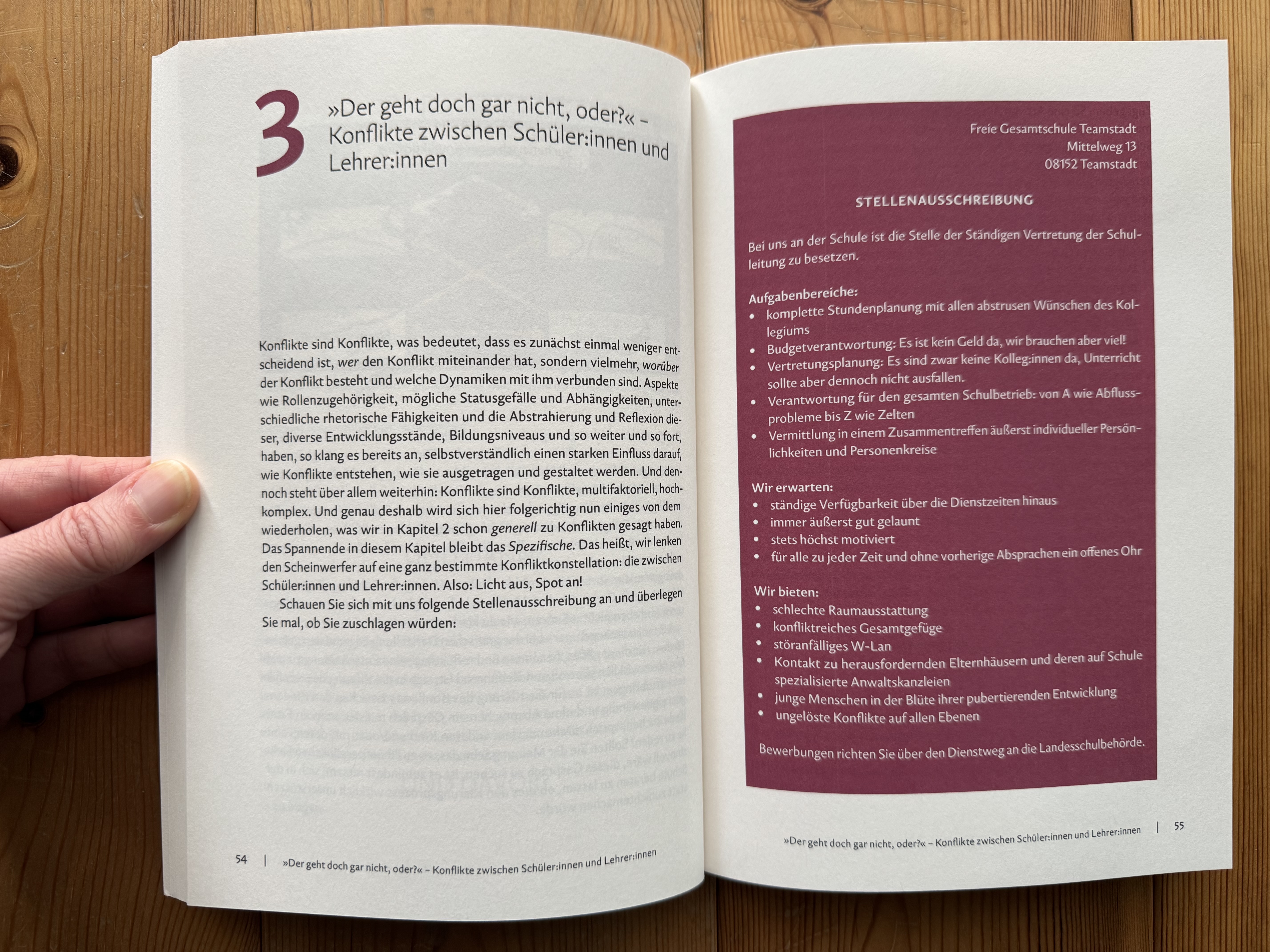 Alle, die sich mit Schulentwicklung interessieren und dabei auch die psychologische Perspektive interessiert, finden hier soliden Lesestoff, der Anregungen zur Kommunikation bietet. Konkrete Spiele und Aktivitäten, vor allem für Lernende ab der Sek. 1 kann man direkt mit in den Alltag nehmen.