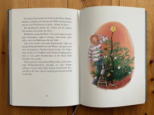 Buchhändler Grimm und sein Zesel Möhrchen durfte ich euch schon einmal vorstellen. Dieses Mal begleiten wir die beiden Freunde durch die Adventszeit. In der gewohnt verspielten, etwas eigentümlichen Art wollen sie sich an keinem der 24 Tage langweilen, was auch gelingt. Jedes Kapitel beginnt mit einem Bild des Weihnachtsbaums, an dem täglich ein neues Schmuckstück angehängt wird (siehe Fotos). So kann man einerseits zurückblicken auf bisherige Geschichten, andererseits immer zu Beginn überlegen, wofür das Neue wohl stehen könnte. Von Vorlesen über Backen, Kuscheln, Budenbauen und Geheimspaziergänge sind dann viele verschiedene Aktionen und Lieder in die Geschichten um das liebenswerte Paar verpackt, in denen auch alte Bekannte wie die „Freiwillige Feline“ nicht fehlen. Ergänzt wird das Buch multimedial durch QR-Codes, über die man sich die Lieder auch anhören kann.