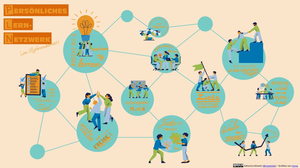 Mein Kern- und Fachseminar haben deshalb von mir obige Grafik bekommen in der Hoffnung, dass sie sich untereinander vernetzen – nach fachlichen oder persönlichen Interessen. Ich habe sehr klar gemacht, dass gemeinsames Planen im Ref nicht sträflich ist und sie sich gern gemeinsam Reihen und Stunden überlegen dürfen. Natürlich muss in einem UB die eigene Leistung erkennbar sein (also muss z. B. die Stunde zur eigenen Klasse auch passen) – aber wie viel cooler ist es denn, die Reihe mit einer Kollegin geplant zu haben, als sie z. B. bei eduki zu kaufen und für sich anzupassen? Im Gespräch kommt doch viel mehr rum, weil man neben Ideen auch Bedenken und Erfahrungen teilen kann. Mir geht es häufig so, dass ich eine grobe Vorplanung für ein Seminar mache und während ich diese meinen Kolleginnen vorstelle merke, wo die Schwachstellen sind – was mir allein sicher nicht so auffallen würde.