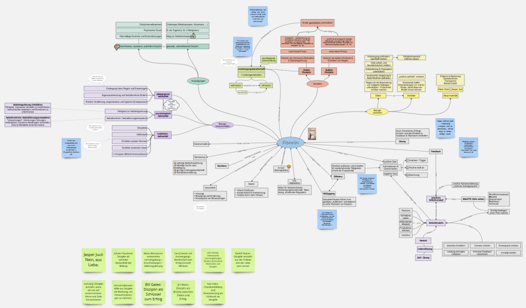 Da ich Anfragen zu meinen Notizen bekommen habe: Hier könnt ihr euch das Ganze in lesbar, zoombar, … ansehen: Miro-Board „Disziplin“