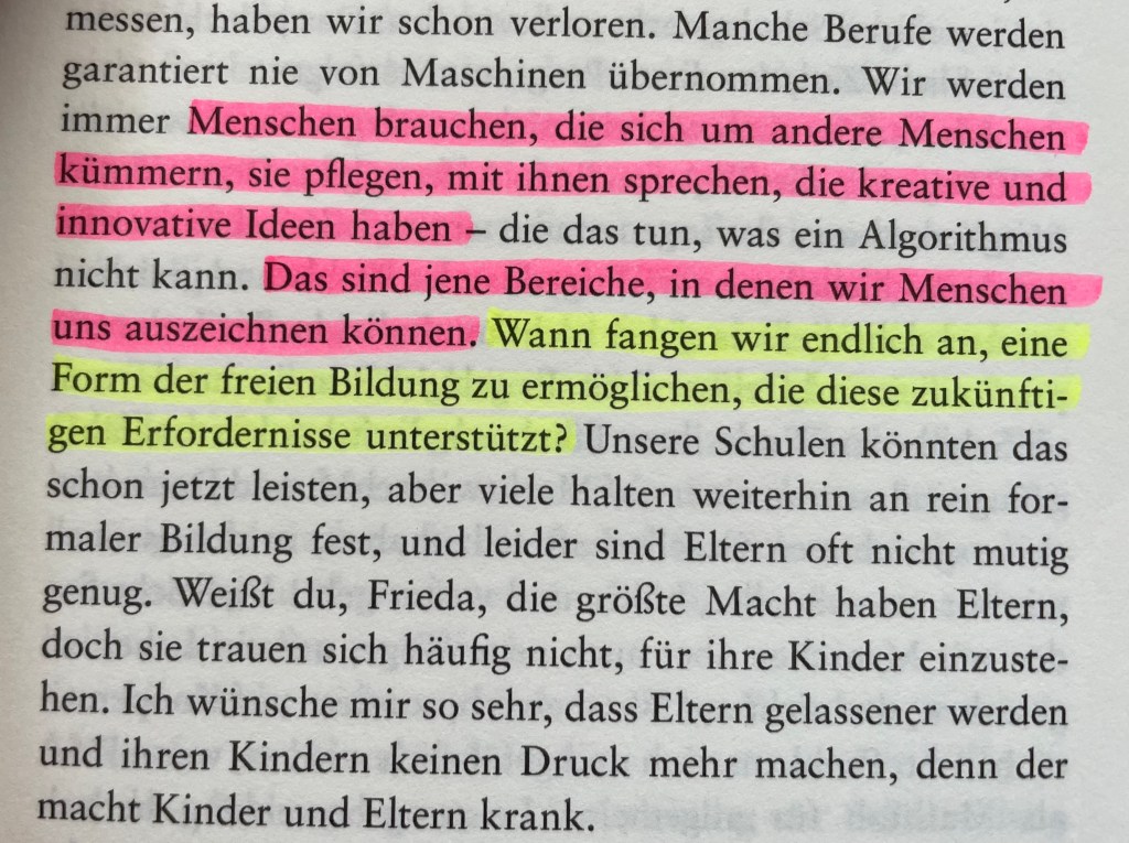Hier noch eine der Stellen im Buch, die mich besonders getriggert hat, weil es mich oft zum Verzweifeln bringt, dass sich so große Teile des Bildungssystems nur darauf stützen, dass wir „das schon immer so gemacht haben“…