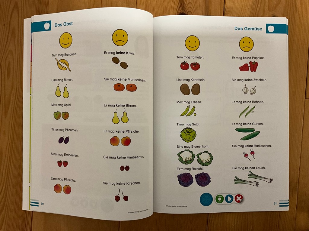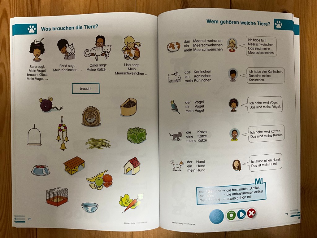 Die Postermotive im Hör-Lese-Buch bieten eine Fülle an Wortschatz und Strukturen. Kleine Geschichten rund um die Leitfiguren Tea, Malek und Hund Lili laden die Kinder dazu ein, in deren fiktive Welt einzutauchen. Viele Gespräche der Leitfiguren lassen sich in Partnerarbeit nutzen. Die Kinder haben auf jeder Doppelseite die Möglichkeit, das sprachlich Gelernte aktiv anzuwenden, indem sie kleine Arbeitsaufträge ausführen: Fragen beantworten, von sich erzählen, Mitschüler*innen interviewen, wie hier zum Beispiel: