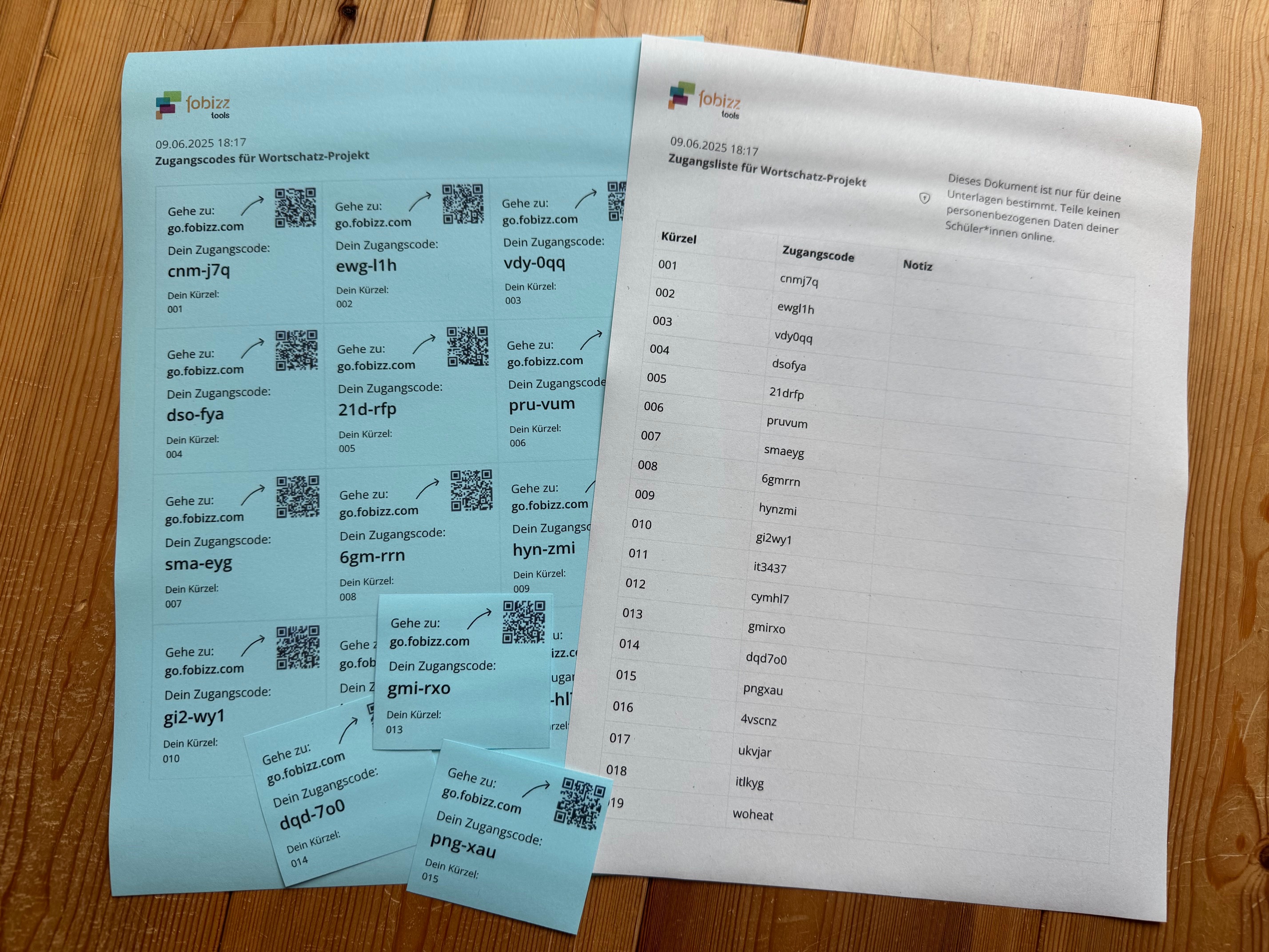 Mit meinem fobizz-Account kann ich auf die KI-Tools dort zurückgreifen und habe einen Klassenraum eingerichtet und dort das Projekt grob skizziert (s. linkes Bild). Klassenräume kann ich für ein ganzes Schuljahr oder für 24 Stunden einrichten. Fobizz generiert mir dann QR-Codes für jedes Kind (s. mittleres Bild) und dazu eine Liste, in der ich als Lehrkraft datenschutzrechtlich unbedenklich die Klarnamen der Kinder notieren kann. Für mein Vorhaben habe ich dann nur die Bild-KI freigegeben. Grundsätzlich könnte man in fobizz auch Text-KI etc. nutzen. Zuletzt habe ich noch die gesammelten Adjektive, ergänzt durch einige aus dem Buch, und ein paar geiegnete Nomen zum Ziehen vorbereitet.