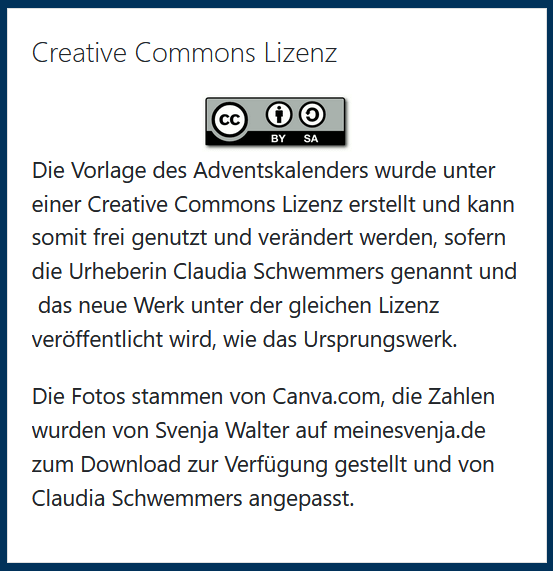 Da ich ja nun schon länger nicht allzu regelmäßig hier aktiv war, habe ich mir etwas überlegt: Alle Ideen, die ich in meinen Moodle-Adventskalender aufgenommen habe, möchte ich euch auch anbieten. Es ist eine ganz bunte Mischung aus Anregungen für die Grundschule oder netten Kleinigkeiten für euch. Deshalb gibt es ab jetzt täglich einen kleinen Post mit einem Link für euch (hoffentlich klappt alles mit dem Vorbereiten und pünktlichen Freigeben der Beiträge!)