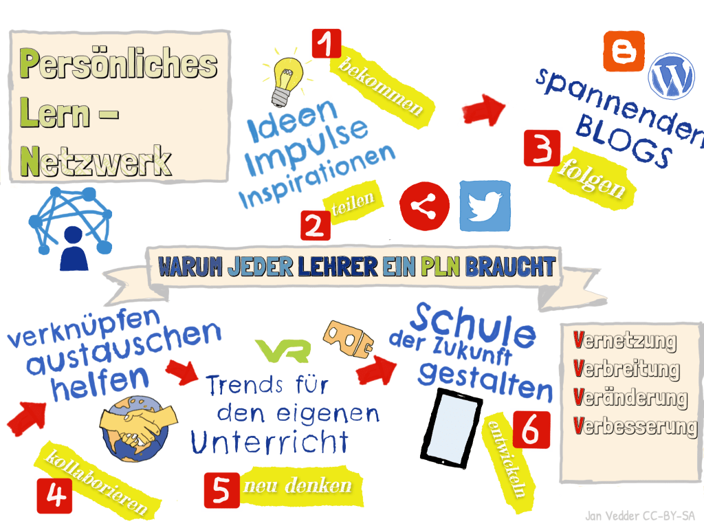 Meinen LAA gebe ich immer wieder den Rat, sich nicht als Einzelkämpfer zu verstehen, sondern sich ein sog. Persönliches Lernnetzwerk aufzubauen (PLN). Jan Vedder (vedducation.de) hat das hier mal ganz anschaulich visualisiert: