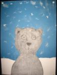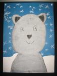 Auf das schwarze Tonpapier mit der Kreide einen Eisbärenumriss (Kopf mit Ohren und Schultern) zeichnen und mit der Kreide füllen; dann mit den Fingern die Kreide verschmieren. Darauf dann mit schwarzem Wachsmaler Augen, Nase, Mund und das Innere der Ohren malen. Den Kopf zuletzt ausschneiden.