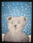 Das weiße Blatt wird im Querformat mittig durchgerissen, dabei Bögen oder eine Rundung bzw. Unebenheiten entstehen lassen. Mit der glatten Seite nach unten auf das hochformatig liegende blaue Tonpapier kleben – so müsste die Breite genau passen. Im Ergebnis haben wir einen verschneiten Boden, der mit Risskante viel effektiver ist als geschnitten. Mit der Kreide werden dann noch mit jeweils drei sich kreuzenden Strichen Schneeflocken auf dem ganzen Blatt verteilt gemalt. Unbedingt erst die Flocken malen und dann den Bärenkopf aufkleben, da sonst der Schnee immer um den Bären herum einen Rahmen bildet und nicht einfach fliegt.