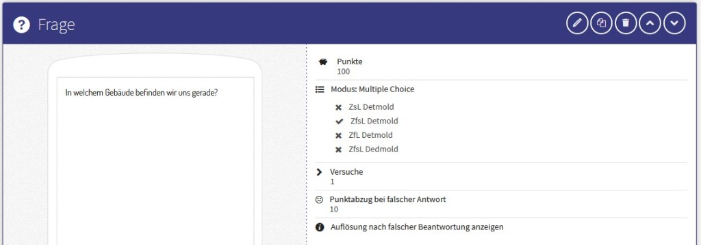 0. Organisatorisches Beide Apps können auf mobilen Geräten zum Spielen eines Parcours bzw. Bounds genutzt werden. Das Anlegen der Aufgaben geht im Browser, wo man sich dann mit seinen Daten anmeldet. Öffentliche Parcours können dann von Jedem gefunden und gespielt werden, aber man kann sie auch als „geheim“ speichern, so dass man nur über einen QR-Code Zugriff bekommt. Ebenfalls einstellbar ist es, ob die Reihenfolge der Aufgaben fest steht oder zufällig ist. Im Lehreraccount kan man sog. Sub-Accounts einrichten: die SuS müssen sich dann nicht selbst auf der Homepage registrieren (Datenschutz) und die Aufgaben aus allen Sub-Accounts können von der Lehrkraft in ein Endprodukt überführt und geordnet werden. Aufgabenformate sind offene Fragen, Multiple-Choice-Fragen, Sortieraufgaben, Schätzaufgaben, Foto-Hochladeaufgaben und andere. Es gibt eine Navigationsfunktion, wenn Teilnehmer an einen bestimmten geografischen Ort geführt werden sollen. Für jede gelöste Aufgabe gibt es Punkte, deren Wert der Ersteller festlegen kann. Auch Einstellungen zum Weiterkommen sind möglich. So sieht beispielsweise eine Aufgabe im Editor aus: