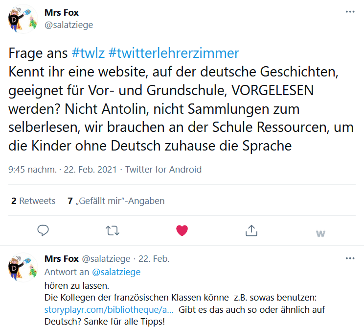 Heute früh startete jemand im Twitterlehrerzimmer eine Frage zu Hörgeschichten zur Sprachförderung: