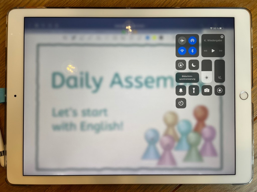 Whiteboard Ich kann Tafelbilder vorbereiten oder mit den Kindern entstehen lassen, indem ich die AirPlay-Funktion meines Tablets nutze und den Bildschirm via AppleTV an den Beamer sende. (Hier habe ich über unsere Ausstattung geschrieben.) Auch Dateien wie die Morning assembly habe ich in GoodNotes gespeichert und kann diese projizieren. Die Vorteile gegenüber einem Tafelbild oder eine Folie auf dem OHP sind die Möglichkeit des Zoomens sowie das Nachträgliche Verschieben von Handgeschriebenem oder Bildern auf der Seite. Beim Anlegen von Mindmaps ist das z.B. sehr hilfreich. Charmant ist bei GoodNotes, dass beim Übertragen des Bildschirms an den Beamer nur die Seite gezeigt wird und nicht das Menü. So kann z.B. weder meine Menüführung noch das Wechseln zwischen Programmfenstern für Unruhe sorgen und es wird nix geteilt, das ich evtl. nicht geteilt sehen möchte.