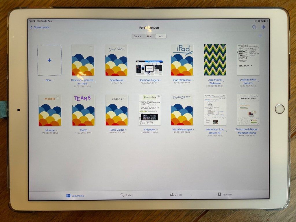 Notizbücher Statt eine Mappe für Konferenzen in der Schule zu führen und eine ebensolche fürs Seminar, Hefte für meine Medienarbeit etc. habe ich nun Ordner bzw. Notizbücher in GoodNotes. Im Ordner „Schule“ z.B. gibt es je Schuljahr ein Notizbuch, in dem alle Konferenzeinladungen liegen sowie meine Konferenznotizen und alles, was org. dazu gehört. Dazu importiere ich die pdf-Dateien der Einladung aus der Mail direkt ins Notizbuch und kann dann Schreibseiten hinzufügen oder direkt in die Einladung schreiben. Hierfür verwende ich die Schrifteingabe mit dem Stift meines iPads, schreibe also wie sonst auf Papier. Allerdings kann ich mir eine Gliederung anfertigen, so dass ich schnell zwischen bestimmten Seiten hin und her navigieren kann.