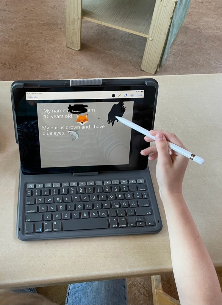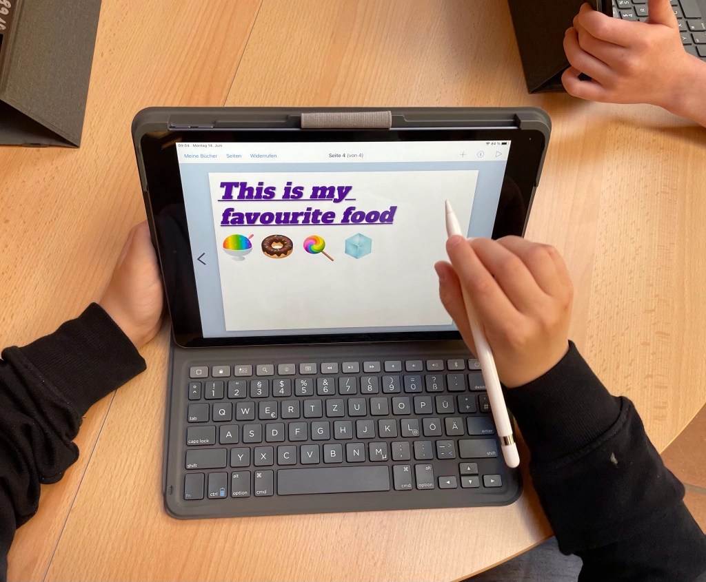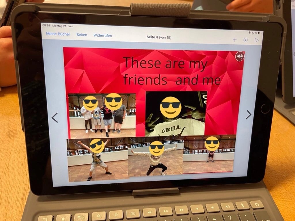 Das freigestellte Bild wurde wieder gespeichert. Nun ging es dann zur App Keynote (wahlweise einem anderen Programm, in dem man Fotos einfügen kann) und die Kinder fügten beide Fotos ein: Hintergrund und freigestellten Vordergrund. Beide mussten nun von der Größe, Drehung und Anordnung angepasst werden, bis jede:r zufrieden war. Das entstandene Fake-Bild haben wir nun einfach über einen Screenshot gesichert (ist ja jetzt unsere Komposition).