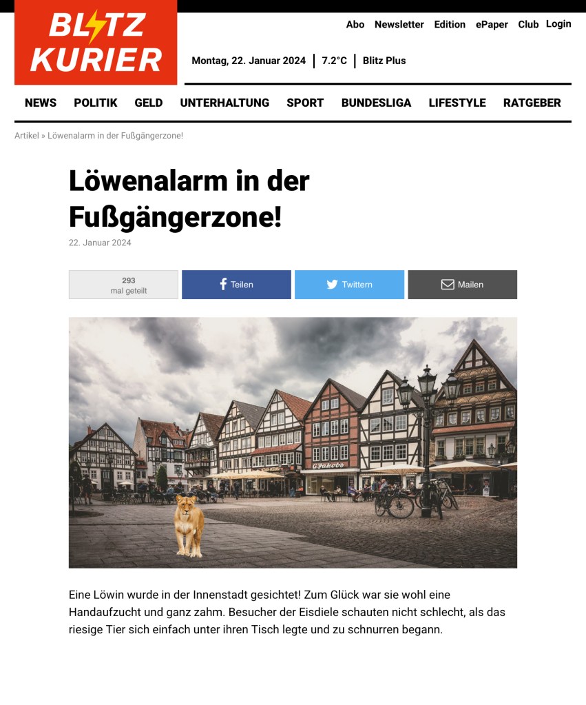 Nach einer kurzen Einführung der Kids in den Plan, das Blaue vom Himmel herunter zu lügen, ging es an die Suche von geeigneten Bildern. Meine vorbereitete Beispielstory handelte von einem Löwen, der auf dem Schulgelände gesichtet wurde. Zur Demonstration der Vorgehensweise entwickelte ich parallel diesen Artikel (rechts).